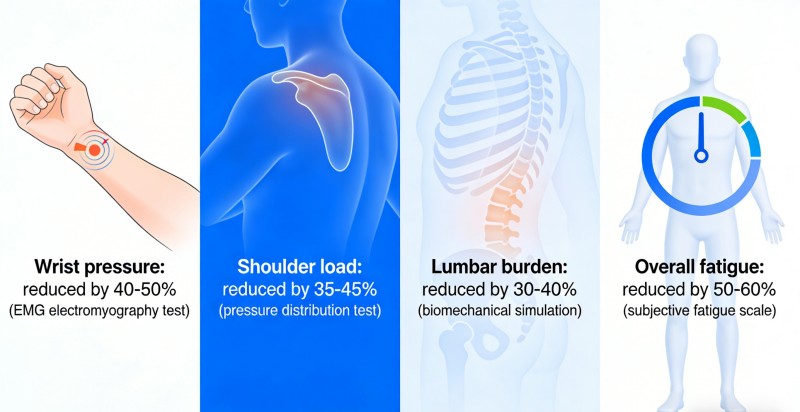 Minskade belastningsrisker Handledstryck: Minskat med 40-50 % (EMG elektromyografitestning) Axelbelastning: Minskad med 35-45% (tryckfördelningstestning) Lägre ryggbörda: Minskad med 30-40 % (biomekanisk simulering) Total trötthet: Minskad med 50-60 % (subjektiv trötthetsskala)