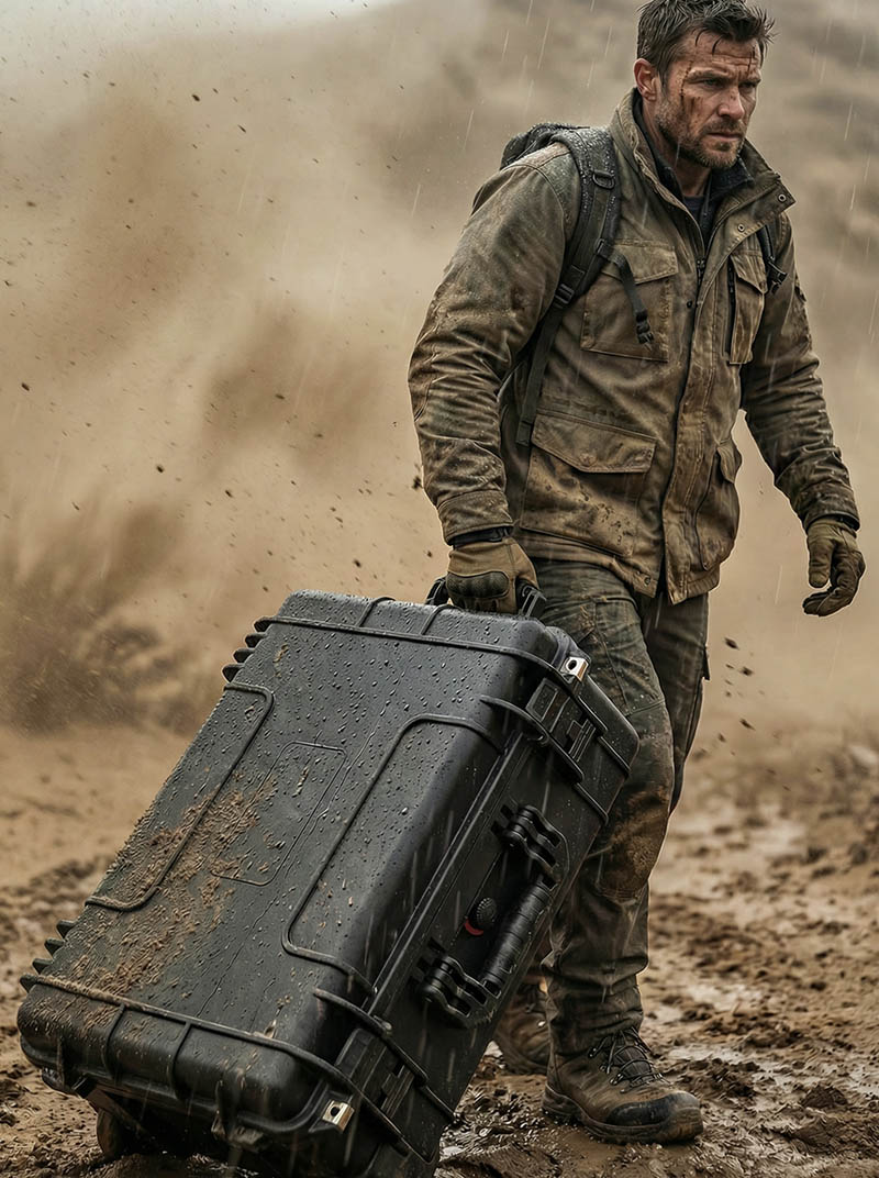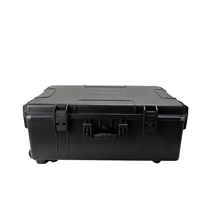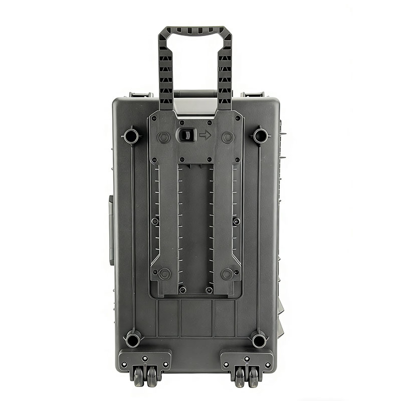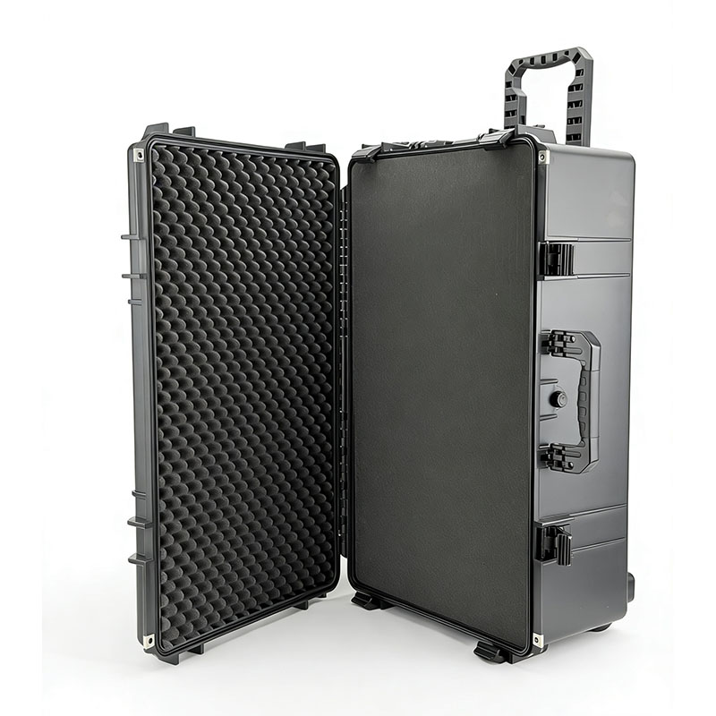 Mobilitets- och manövreringssystem av industriell kvalitet: Att flytta ett sådant kraftigt skyddsfodral kräver verklig industriell design. Vi har utrustat den med ett infällbart dragstångssystem för mer stabil dragkraft; fyra lagerutrustade hjul med stor diameter, placerade under dragstången, garanterar säkerhet i sluttningar eller när de står stilla i ett fordon. Detta system gör det möjligt för en enda person att enkelt manövrera en last på nästan 100 kg och flytta den lika smidigt som en vanlig resväska på plan mark.