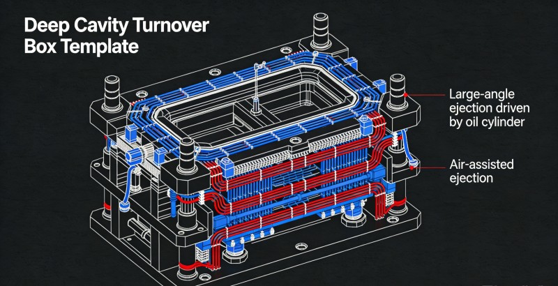 Utmaning: Stora volymer och tjocka väggar av logistikcontainrar resulterar i förlängda kylningstider, vilket begränsar produktionskapaciteten. Lösning: Designa flerlagers seriella höghastighetskylningskanaler som tätt täcker alla tjockväggiga områden. För behållare med djup hålighet, kombinera "hydrauliska cylinderdrivna lutande ejektorer med stor vinkel" med "gasassisterad utkastning" för att säkerställa smidig, snabb urtagning på minimal tid utan deformation eller vakuumvidhäftning, vilket minimerar produktionscyklerna.