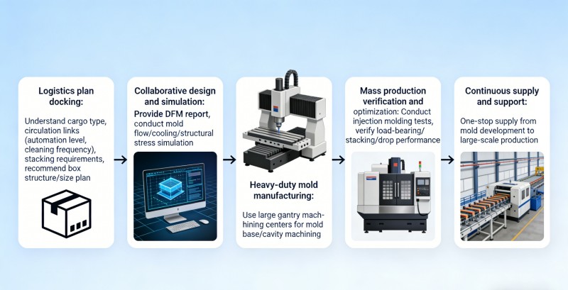 1. Inriktning av logistiklösning: Förstå din lasttyp, hanteringsstadier (t.ex. automationsnivå, rengöringsfrekvens) och staplingskrav för att rekommendera optimal containerstruktur och -storlekslösningar. 2. Samarbetsdesign och simulering: Tillhandahåll omfattande DFM-rapporter och genomför simuleringar av formflöde, kylning och strukturella spänningar för att säkerställa optimala formlösningar både vad gäller prestanda och kostnad. 3. Heavy-Duty formtillverkning: Använd stora portalbearbetningscenter för att garantera precision och styvhet vid bearbetning av stora formbaser och hålrum. 4. Massproduktionsvalidering och optimering: Genomför kontinuerliga produktionstester på formsprutningsmaskiner för att validera kritiska prestandamått (lastbärande, stapling, falltester) och slutföra processer. 5. Kontinuerlig försörjning och support: Vi erbjuder ett enda utbud från formutveckling till storskalig formsprutningsproduktion, vilket säkerställer konsekvent produktkvalitet och snabb leverans.